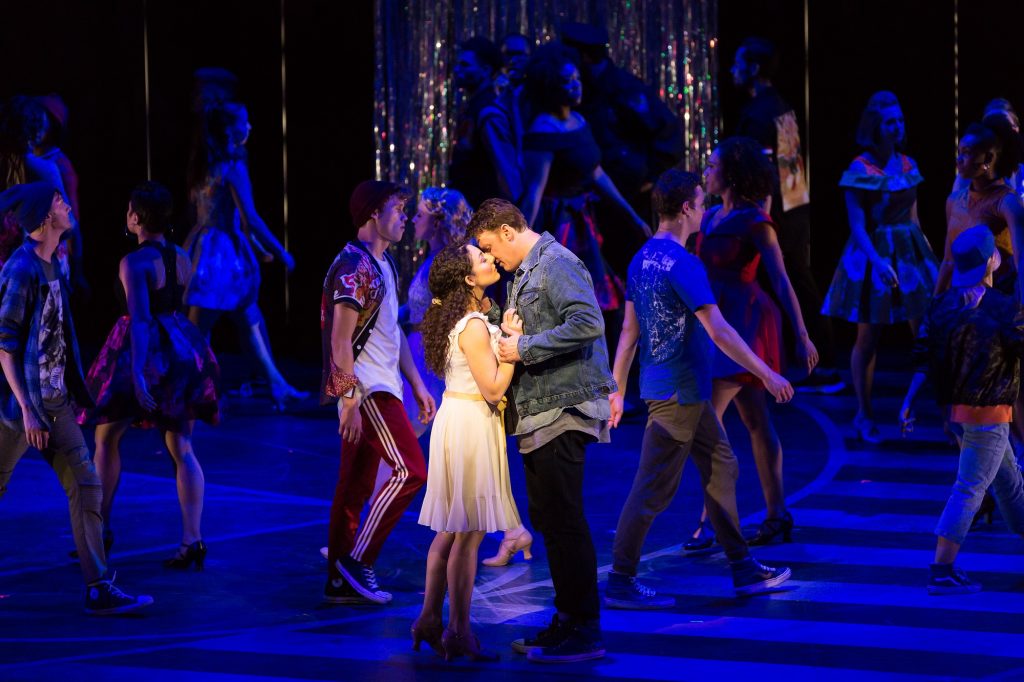 At the dance in the local gym, the group is divided: Jets and their girls on one side and Sharks and their girls on the othe. Riff and his lieutenants move to challenge Bernardo and his lieutenants, but they are interrupted by Glad Hand, the chaperone who is overseeing the dance, and Officer Krupke. The two initiate some dances to get the kids to dance together, across the gang lines. In the promenade leading up to the dance, though, the girls and boys end up facing each other at random, Jet girls across from Shark boys and vice versa. Bernardo reaches across the Jet girl in front of him to take Anita’s hand, and Riff does the same with his girlfriend, Velma. Everyone dances with their own group as Tony enters (“Mambo”). During the dance, Maria and Tony spot each other. There is an instant connection. Bernardo interrupts them, telling Tony to stay away from his sister and asking Chino to take her home. Riff and Bernardo agree to meet at Doc’s in half an hour for the war council. As everyone else disappears, Tony is overcome with the feeling of having met the most beautiful girl ever (“Maria”).